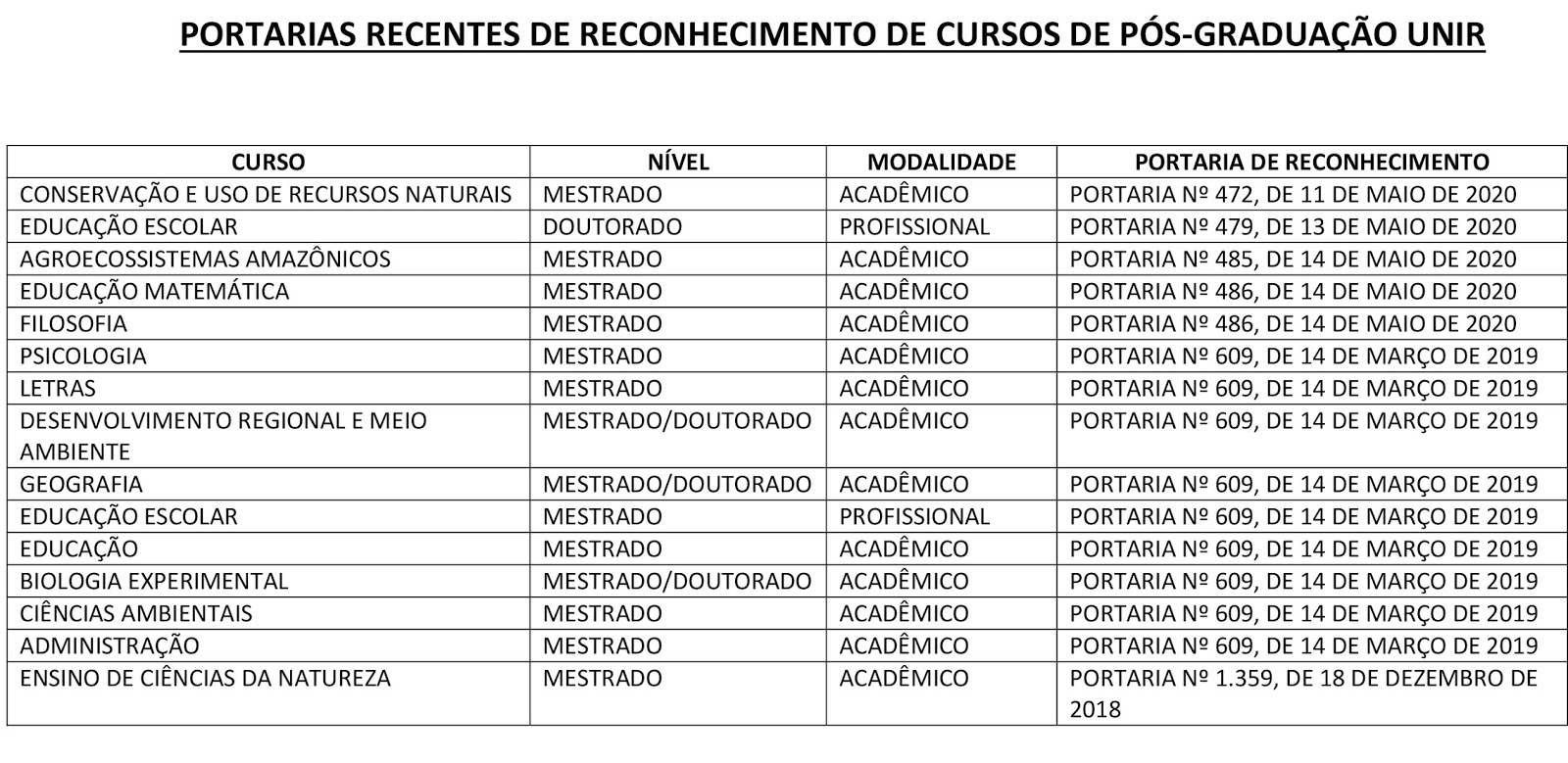 Pelo menos dezoito cursos de pós-graduação stricto sensu, abrangendo mestrados e de doutorados, da Fundação Universidade Federal de Rondônia (UNIR) já contam com o reconhecimento do Ministério da Educação. Cinco deles tiveram sua portaria editada nos dias 11 a 14 deste mês: os mestrados acadêmicos em Conservação e Uso de Recursos Naturais, Agroecossistemas Amazônicos, Educação Matemática e Filosofia e o doutorado profissional em Educação Escolar.