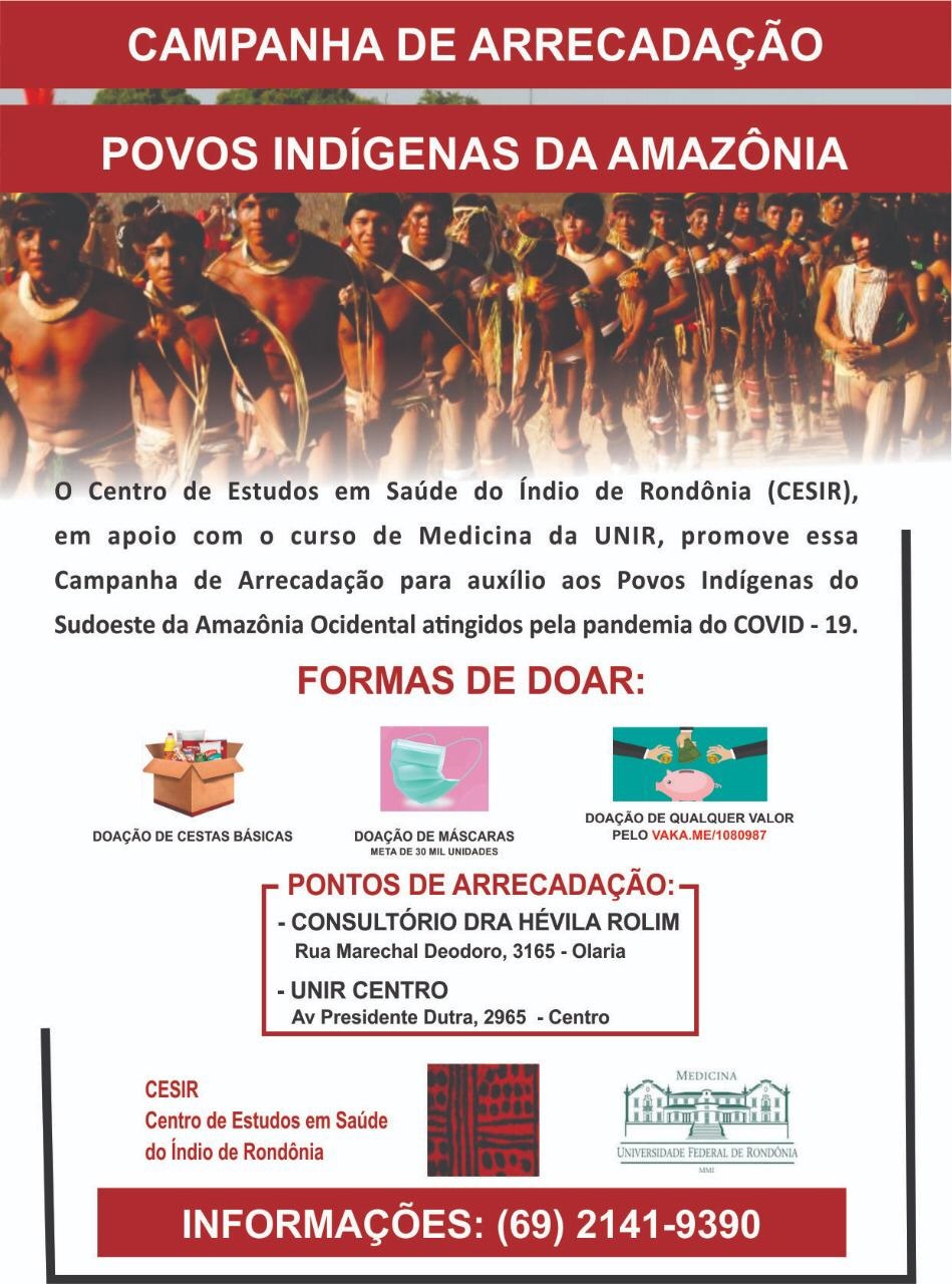 O curso de Medicina da Fundação Universidade Federal de Rondônia (UNIR), em parceria com o Centro de Estudos em Saúde do Índio de Rondônia (CESIR), promovem campanha de arrecadação para auxílio aos povos indígenas do sudoeste da Amazônia Ocidental, atingidos pela pandemia de COVID-19.
