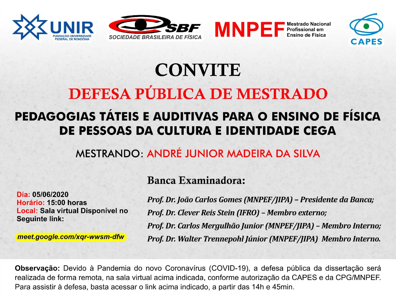 O Programa Nacional de Mestrado Profissional em Ensino de Física (MNPEF) da Fundação Universidade Federal de Rondônia (UNIR), Polo de Ji-Paraná, programa nacional de pós-graduação de caráter profissional, voltado a professores de ensino médio e fundamental com ênfase principal em aspectos de conteúdos na Área de Física é uma iniciativa da Sociedade Brasileira de Física (SBF) com o objetivo de coordenar diferentes capacidades apresentadas por diversas Instituições de Ensino Superior (IES) distribuídas em todas as regiões do País e realizará defesa pública do acadêmico, André Junior Madeira Da Silva, com dissertação e produto educacional intitulados "Pedagogias Táteis e Auditivas Para O Ensino De Física de Pessoas da Cultura Cega".