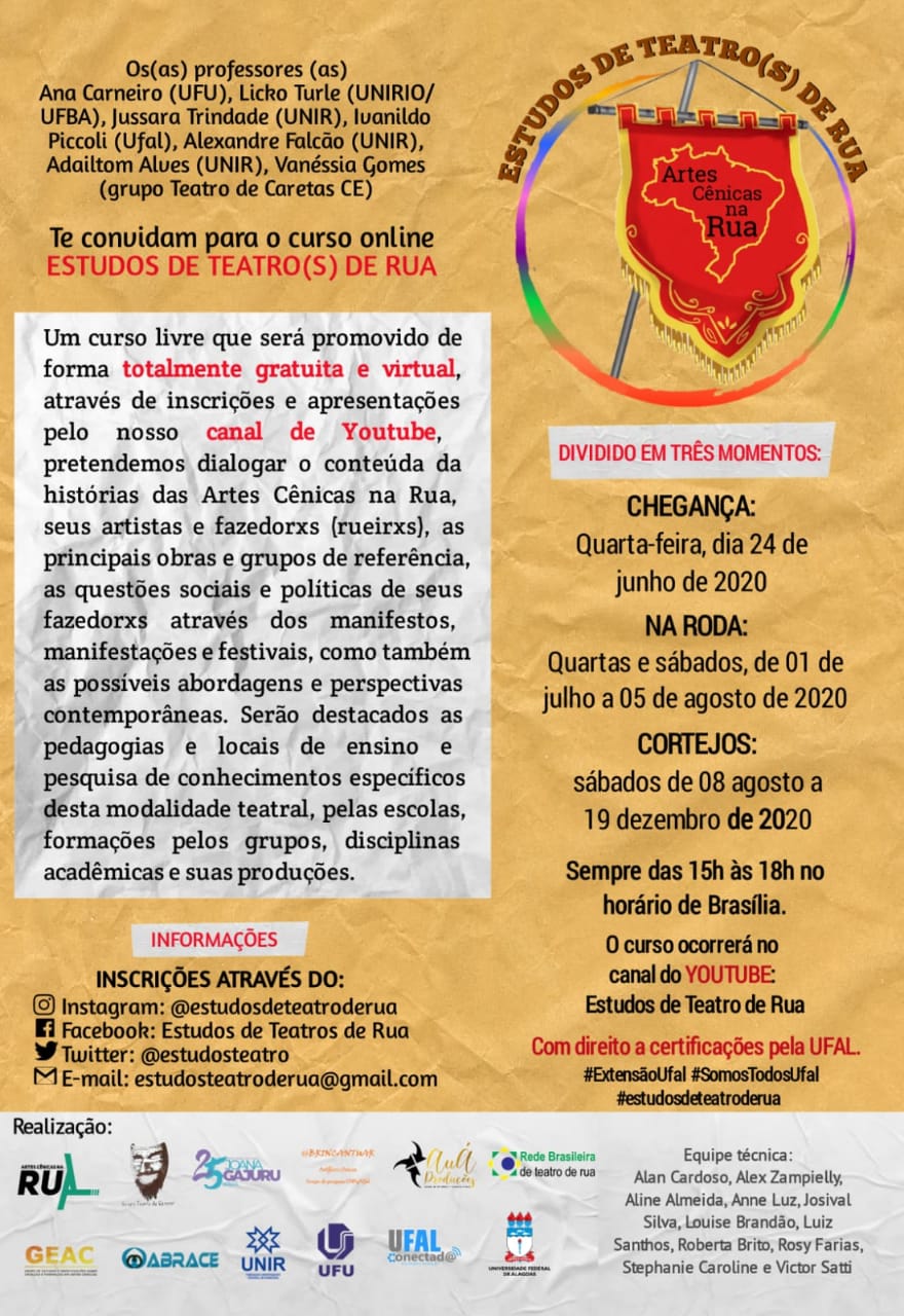 O curso será promovido no formato de “webinários”, transmitidos a partir da Universidade Federal de Alagoas (Ufal), com direito a certificação. As inscrições são permanentes e podem ser feitas por meio do endereço: https://linktr.ee/estudosdeteatroderua