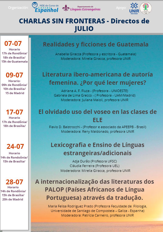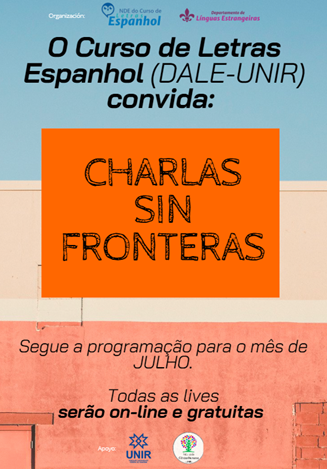 O curso de Letras-Espanhol do departamento de Línguas Estrangeiras da Fundação Universidade Federal de Rondônia (UNIR), por meio do Programa de Extensão "Trânsitos, Fronteiras, Migração e Línguas Adicionais na Amazônia", convida discentes, docentes e comunidade em geral para participar do Projeto CHARLAS SIN FRONTERAS na modalidade online - Edição Programação do Mês de Julho de 2020.