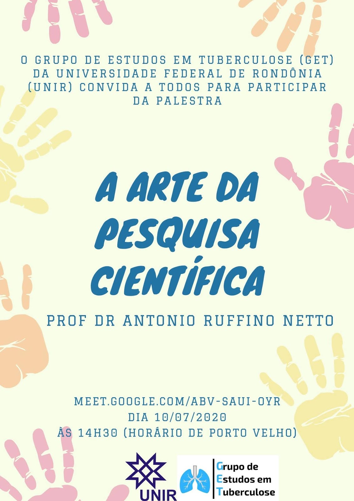 O Grupo de Estudos em Tuberculose (GET) da Fundação Universidade Federal de Rondônia (UNIR) convida a todos para participar da palestra "A Arte da Pesquisa Cientifica" que terá como mediador o Professor doutor Antonio Ruffino Netto, médico, pós-doutor em Harvard, professor titular na Faculdade de Medicina de Ribeirão Preto da Universidade de São Paulo (USP), coordenador do Conselho Nacional de Desenvolvimento Científico e tecnológico (CNPq), Membro do Comitê Científico de Revista da Universidad de Buenos Aires, Assessor do Comitê Técnico em Tuberculose pela Secretaria de Vigilância em Saúde, Coordenador Geral da Rede Brasileira de Pesquisa em Tuberculose (REDE TB).