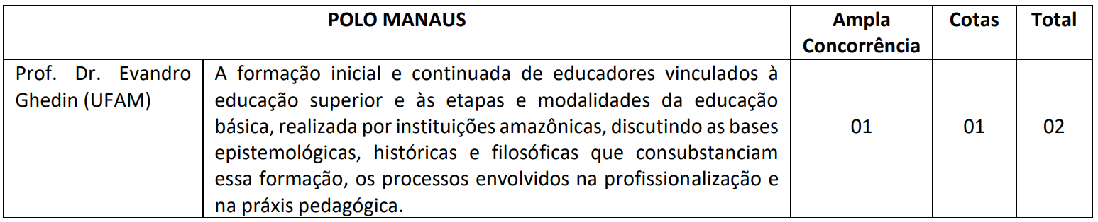 O Colegiado do Curso de Doutorado em Educação na Amazônia (PGEDA), Associação Plena em Rede das Instituições Universidade Federal do Pará (UFPA); Universidade Federal do Amazonas (UFAM); Universidade Federal do Oeste do Pará (UFOPA); Universidade Federal de Roraima (UFRR); Universidade do Estado do Amazonas (UEA); Universidade Federal do Tocantins (UFT); Universidade Federal do Acre (UFAC); Universidade Federal do Amapá (UNIFAP); Universidade Federal de Rondônia (UNIR), faz saber que, no período de 24/08 a 30/09/2020, estarão abertas inscrições para a seleção de candidatos para preenchimento de até 94 (noventa e quatro) vagas, distribuídas entre os seus Polos, conforme o Edital disponível para download no arquivo abaixo.