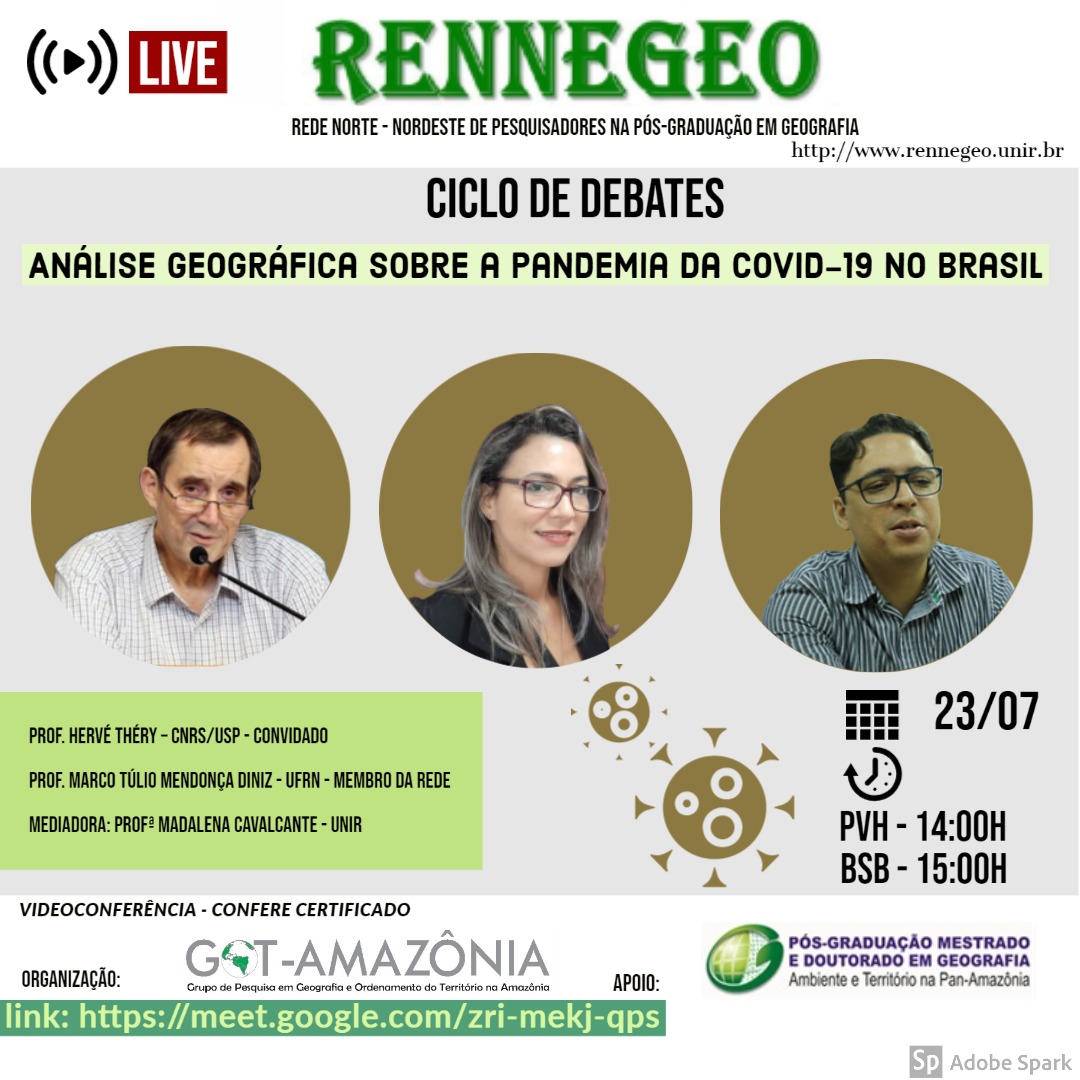 A Rede Norte-Nordeste de Pesquisadores na Pós-Graduação em Geografia (RENNEGEO), promove o inicio do ciclo de debates com o Tema: Análise Geográfica sobre a Pandemia da Covid-19 no Brasil. A organização é do Grupo de Pesquisa em Geografia e Ordenamento do Território na Amazônia (GOT-Amazônia) com apoio da Pós-Graduação em Geografia da Fundação Universidade Federal de Rondônia (UNIR).