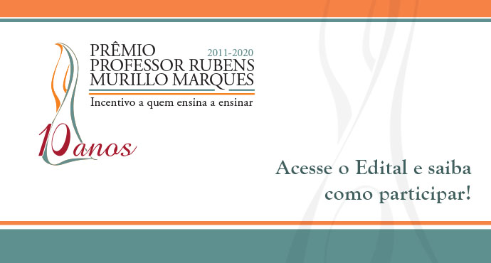 Estão abertas as inscrições da 10ª Edição do Prêmio Professor Rubens Murillo Marques. Em 2020, a Fundação Carlos Chagas (FCC) celebra os dez anos da iniciativa que valoriza professores formadores de cursos de licenciatura e de pedagogia, divulgando experiências que contribuem para a aprendizagem da docência do futuro professor da educação básica. A submissão de projetos pode ser realizada no sistema on-line até 10 de agosto de 2020.