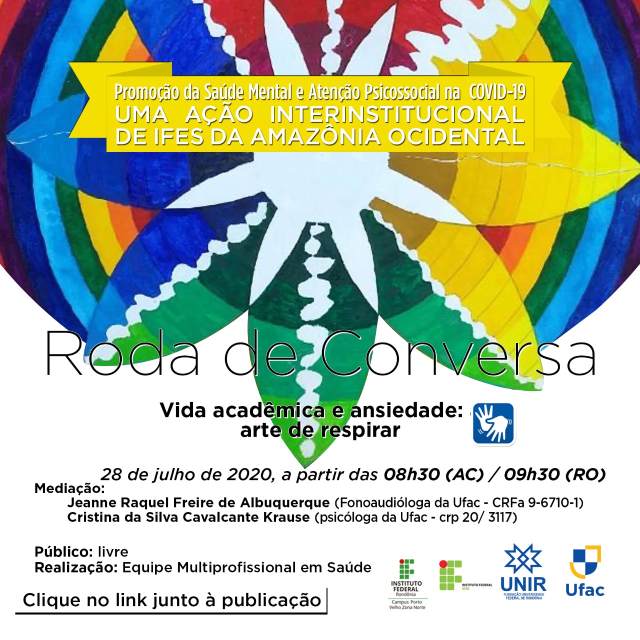 A Pró-Reitoria de Cultura, Extensão e Assuntos Estudantis (PROCEA) da Fundação Universidade Federal de Rondônia (UNIR) convida a comunidade universitária a participar da Roda de Conversa on-line com o tema "Vida acadêmica e ansiedade: arte de respirar". O evento será realizado nesta terça-feira (28), às 9h30, no horário de Rondônia.