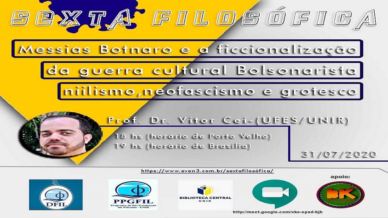 A Biblioteca Central e o departamento de Filosofia (DFIL) da Fundação Universidade Federal de Rondônia (UNIR), divulgam evento da série on-line Sextas Filosóficas que acontecerá nesta sexta-feira (31), às 18h, com o tema “Messias Botnaro e a ficcionalização da Guerra Cultural Bolsonarista: niilismo, neofascismo e grotesco”.