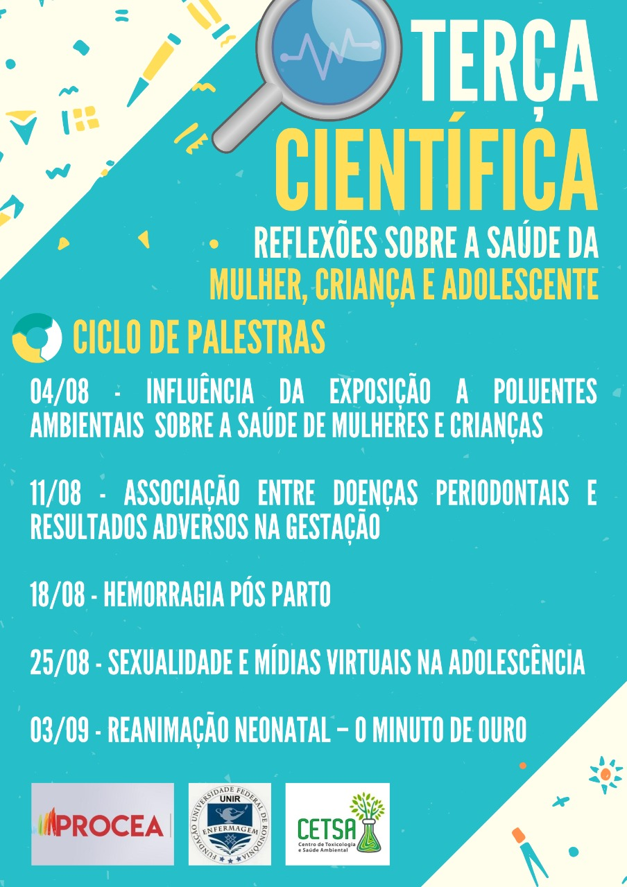 O Departamento de Enfermagem e o Centro de Toxicologia e Saúde Ambiental (CETSA) da Fundação Universidade Federal de Rondônia (UNIR) desenvolveram o evento de extensão "Terça científica - reflexões sobre a saúde da mulher, criança e adolescente", sob coordenação da professora doutora Mônica Pereira Lima Cunha. Os encontros acontecerão on-line nos dias 04,11,18,25 de agosto 08 e 03 de setembro, às 18h.