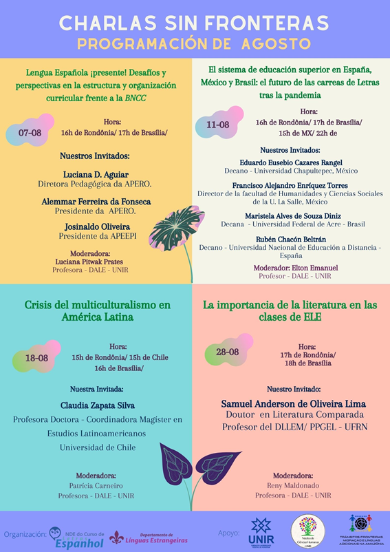 O curso de Letras-Espanhol do Departamento de Línguas Estrangeiras (DALE) da Fundação Universidade Federal de Rondônia (UNIR), por meio do Programa de Extensão "Trânsitos, Fronteiras, Migração e Línguas Adicionais na Amazônia", convida discentes, docentes e comunidade em geral para participar do Projeto Charlas Sin Fronteras na modalidade online, Edição Programação do Mês de Agosto de 2020.