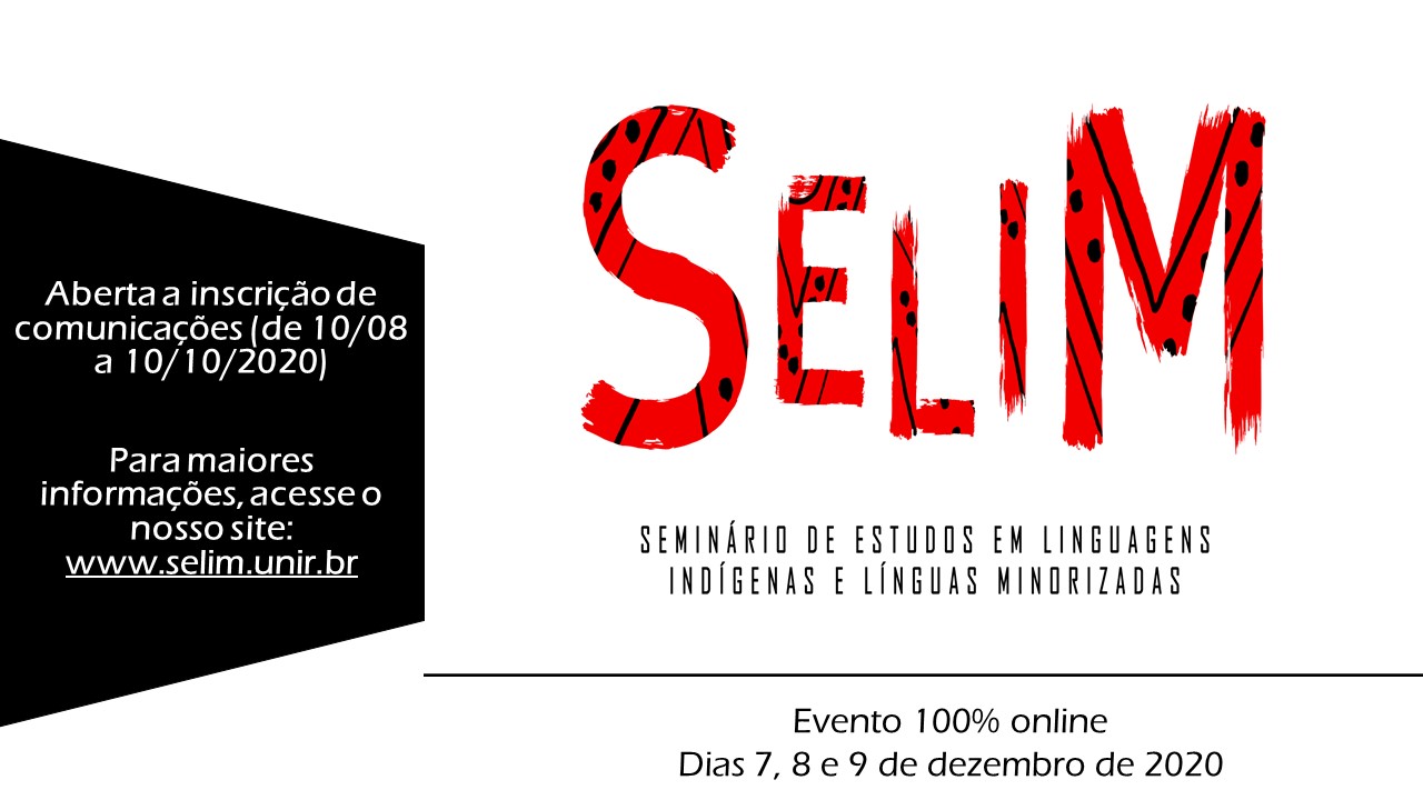 O Grupo de Pesquisa em Estudos da Línguagem (GPEL) da Fundação Universidade Federal de Rondônia (UNIR), com o apoio da Coordenação de Aperfeiçoamento de Pessoal de Nível Superior (CAPES), convida a comunidade acadêmico-científica para a inscrição de comunicações no I Seminário de Estudos em Linguagens Indígenas e Línguas Minorizadas (SELIM).