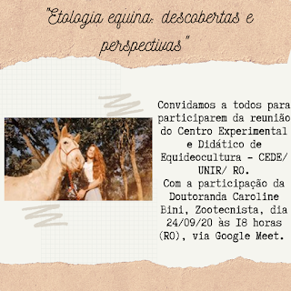 O Centro Experimental e Didático de Equideocultura (CEDE) pertencente a Fundação Universidade Federal de Rondônia (UNIR), campus de Presidente Médici, tendo como coordenadora a professora doutora Bruna Rafaela Caetano Nunes Pazdiora, lotada no curso de Zootecnia, está realizando várias palestras abertas ao público, envolvendo temas relacionados a Equideocultura e as Terapias e Atividades assistidas com Equinos.