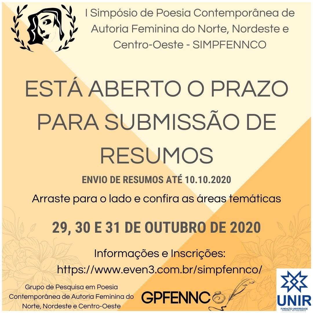 O Grupo de Pesquisa em Poesia Contemporânea de Autoria Feminina do Norte e Nordeste e Centro-Oeste (GPFENNCO) da Fundação Universidade Federal de Rondônia (UNIR) promoverá o I Simpósio de Poesia Contemporânea de Autoria Feminina do Norte, Nordeste e Centro-Oeste (SIMPFENNCO) no período de 29 a 31 de outubro, na modalidade on-line.