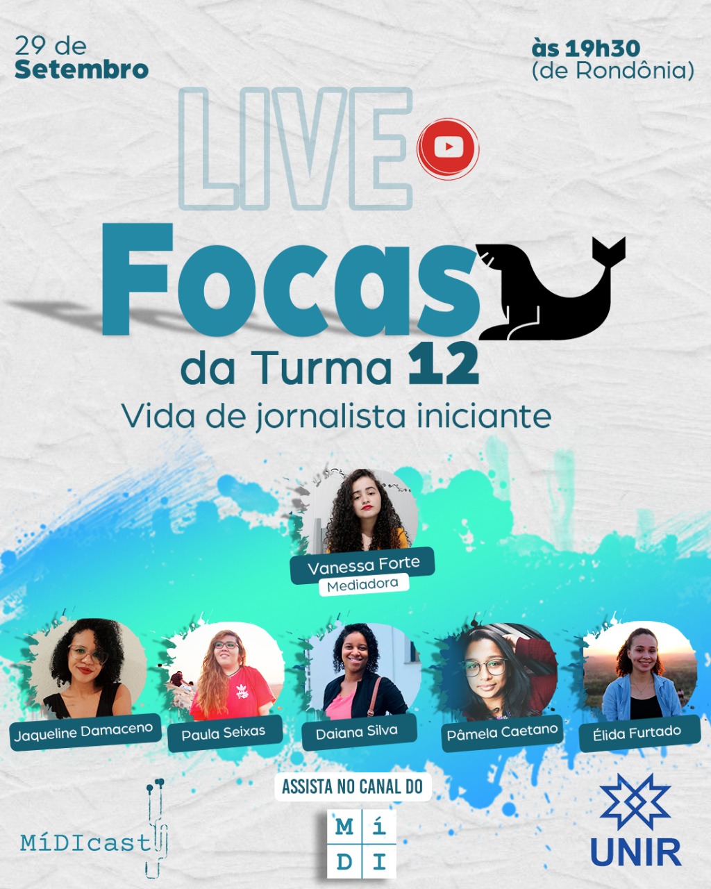 O MíDIcast recebe algumas das jornalistas egressas mais recentemente pela Fundação Universidade Federal de Rondônia (UNIR). Todas empregadas na área, elas contam como é sair da universidade e se inserir no mercado de trabalho. A conversa cujo tema é "Focas da Turma 12: vida de jornalista iniciante" acontece às 19h30 (Horário de Rondônia), nesta terça-feira (29), no canal do MíDI no YouTube.