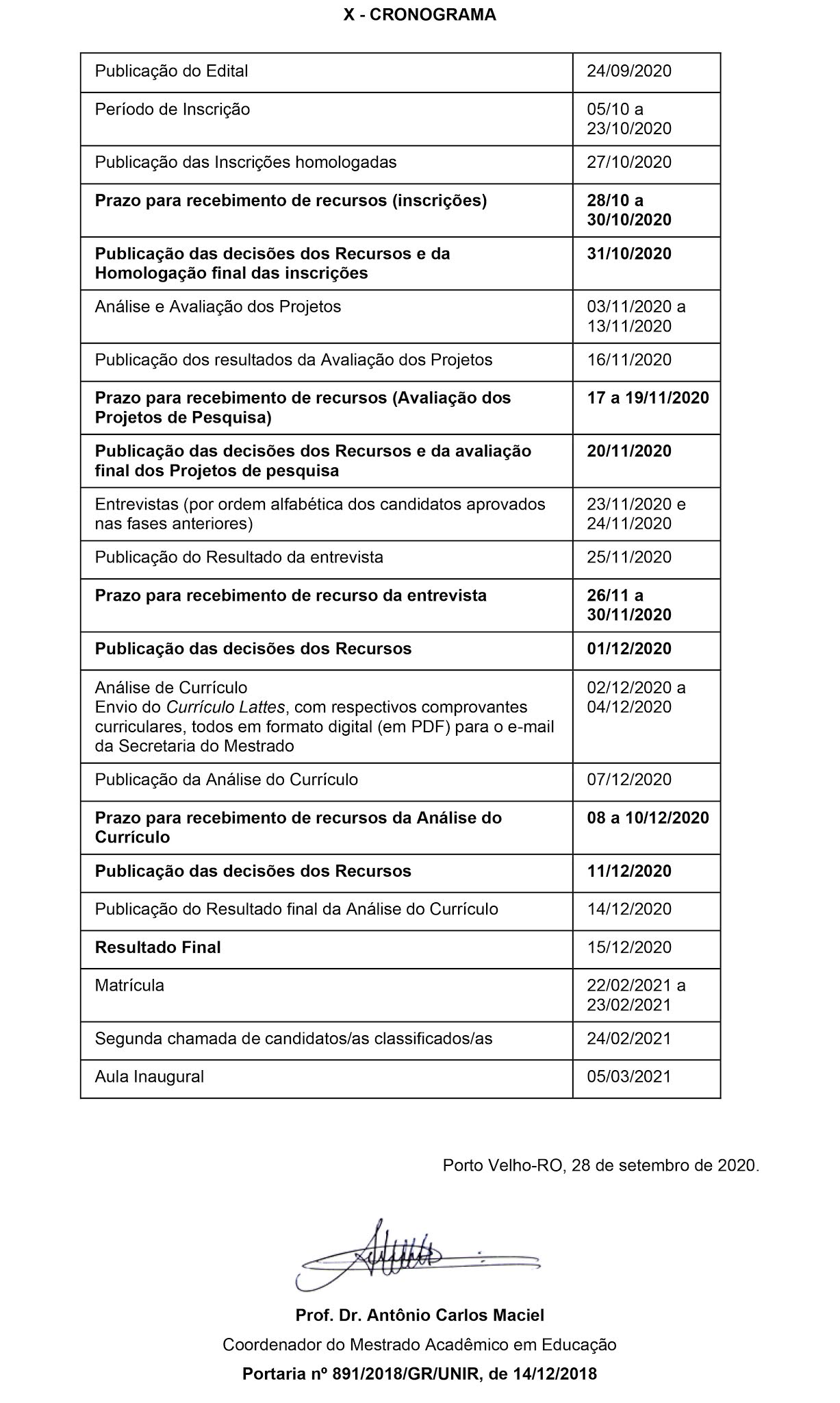 A Coordenação do Programa de Pós-Graduação Stricto Sensu em Educação – Mestrado Acadêmico em Educação da Fundação Universidade Federal de Rondônia (PPGE/UNIR), no uso de suas atribuições conferidas pelo Regimento Interno do Programa, pela legislação da UNIR e pela legislação federal e, considerando a exiguidade do prazo para a apresentação de recursos nas diferentes etapas do certame, retifica o item X do presente Edital.