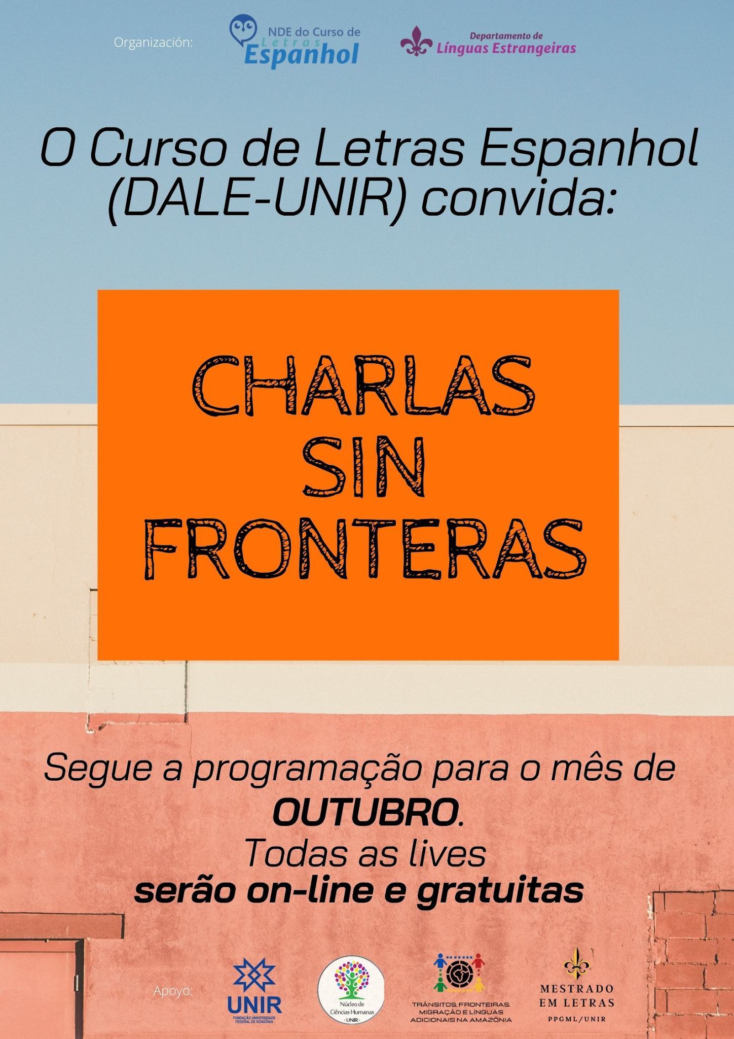 O curso de Letras-Espanhol do Departamento de Línguas Estrangeiras (DALE) da Fundação Universidade Federal de Rondônia (UNIR), por meio do Programa de Extensão "Trânsitos, Fronteiras, Migração e Línguas Adicionais na Amazônia", convida discentes, docentes e comunidade em geral para participar do Projeto CHARLAS SIN FRONTERAS na modalidade online - Edição Programação do Mês de Outubro de 2020.
