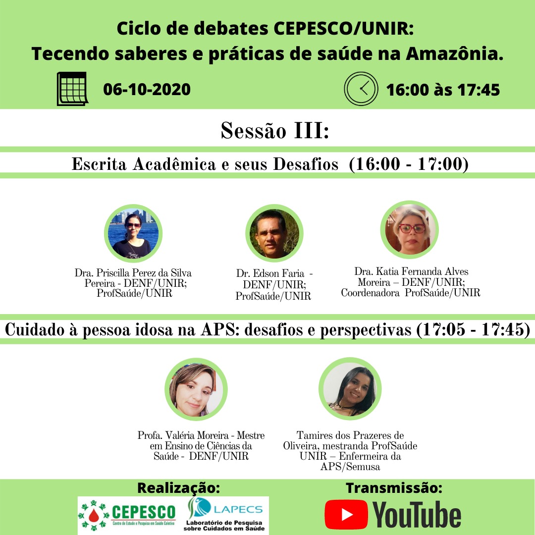 O ciclo terá a Sessão III com duas palestras, intituladas “Escrita Acadêmica e seus Desafios”, das 16h às 17h, e “Cuidado à pessoa idosa na APS: desafios e perspectivas”, das 17h05 às 17h45. A transmissão será feita no canal do Centro de Estudo e Pesquisa em Saúde Coletiva no Youtube.