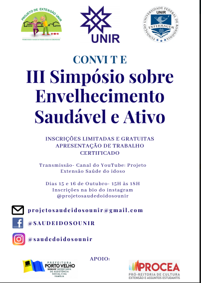 As incrições serão aceitas até o dia 14 de outubro pelo link https://www.even3.com.br/iiisimposio_sobre_envelhecimento_saudavel_e_ativo/