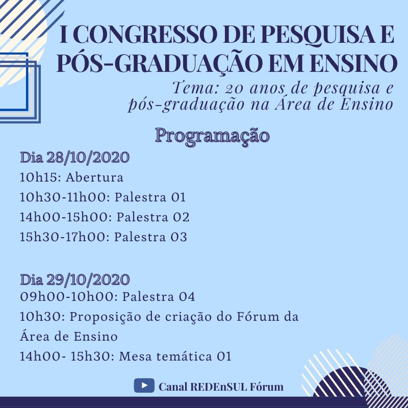 O Programa de Pós-graduação em Ensino (PPGECN) está organizando um congresso de grande importância para a Área de Ensino, trata-se do I CONGRESSO DE PESQUISA E PÓS-GRADUAÇÃO EM ENSINO: "20 anos de pesquisa e pós-graduação na Área de Ensino", nos dias 28 e 29 de Outubro.