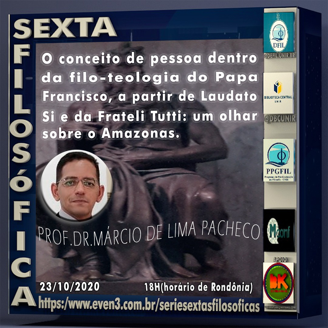 A Biblioteca Central e o Departamento de Filosofia (DFIL) da Fundação Universidade Federal de Rondônia (UNIR) divulgam evento da série online Sextas Filosóficas, que acontecerá no dia 23 de outubro, às 18h, tendo como tema “O conceito de pessoa dentro da filo-teologia do Papa Francisco, a partir de Laudato Si e da Frateli Tutti: um olhar sobre o Amazonas”.