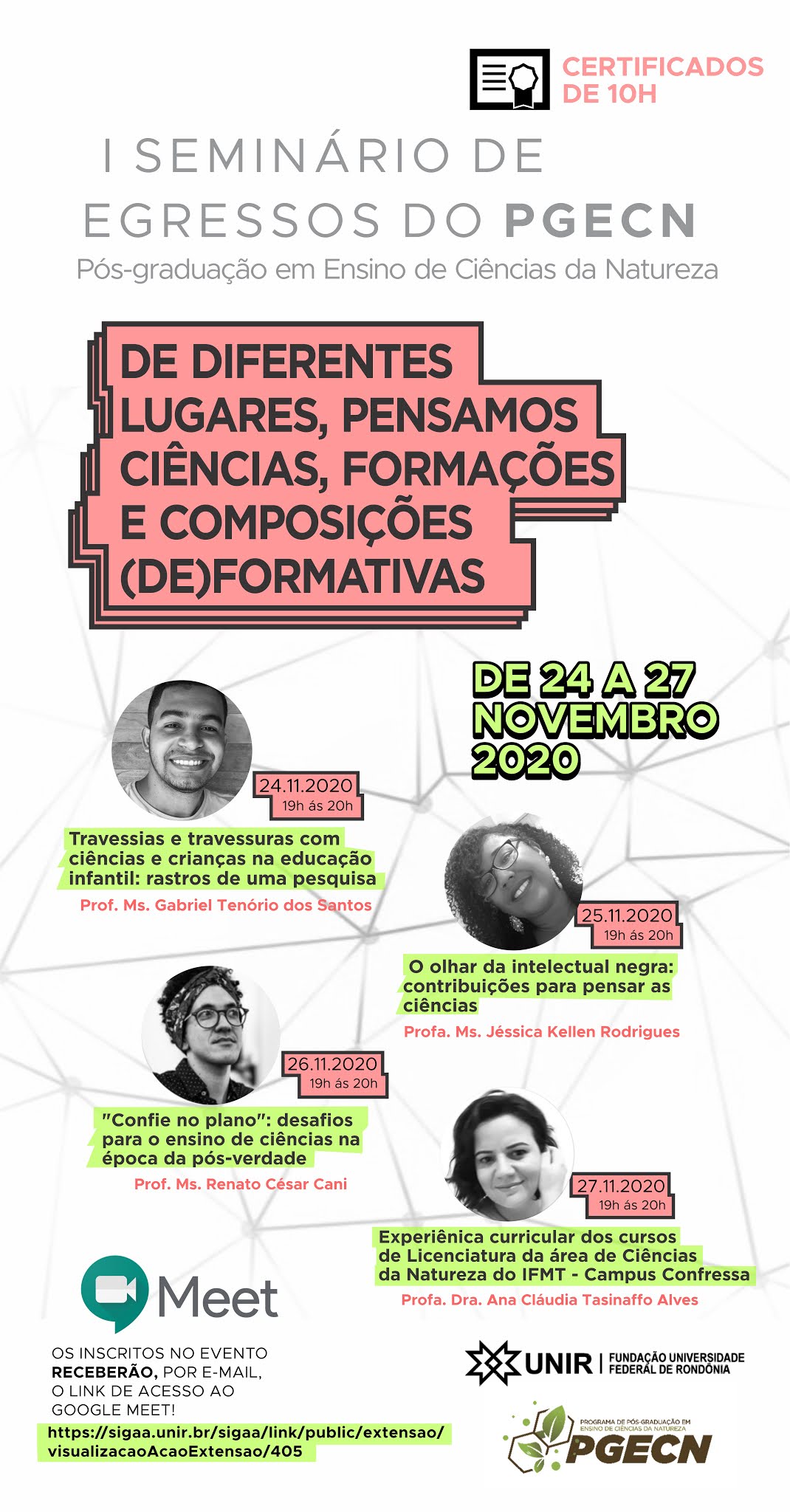 No período de 24 a 27 de novembro acontecerá o I Seminário de Egressos do Mestrado Acadêmico em Ensino em Ciências da Natureza da Fundação Univerisidade Federal de Rondônia (UNIR). Os moderadores do evento serão os egressos mestresGabriel Tenório, Priscila Cofani, Sonia Schneider e Andreia Valenga. As palestras serão transmitidas via plataforma Google Meet.