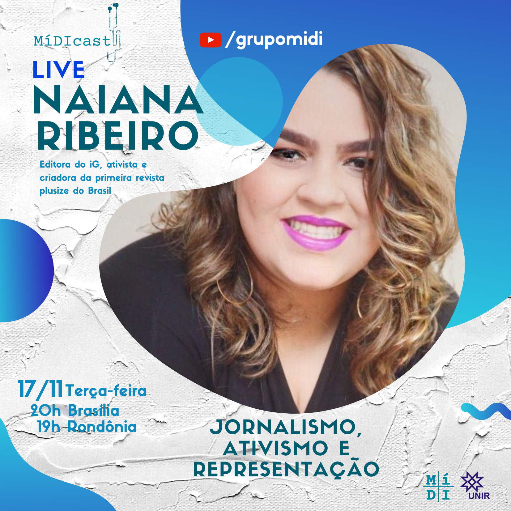 Naiana Ribeiro trabalha como jornalista e criadora de conteúdo na internet. A editora do iG, ex-repórter do Correio* e influenciadora digital é a convidada do MíDIcast para uma conversa sobre "Jornalismo, ativismo e representação". O encontro acontece às 19h (de Rondônia) e 20h (de Brasília) no dia 17 de novembro de 2020 (terça-feira), no canal do MíDI no YouTube.