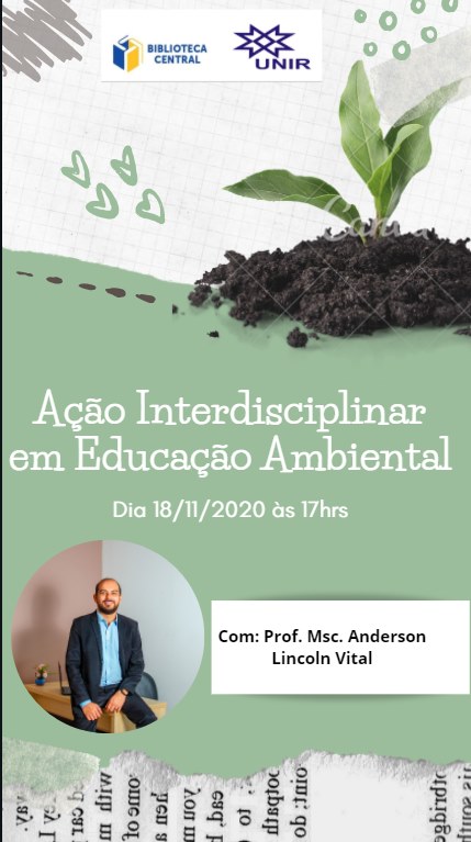 A Biblioteca Central da Fundação Universidade Federal de Rondônia (UNIR) convida a comunidade interna e externa para participar da apresentação “Ação Interdisciplinar em Educação Ambiental”. O evento acontecerá amanhã (18), às 17h (horário de Rondônia) e será ministrada pelo professor mestre Anderson Vital da Universidade Federal do Amazonas (UFAM).
